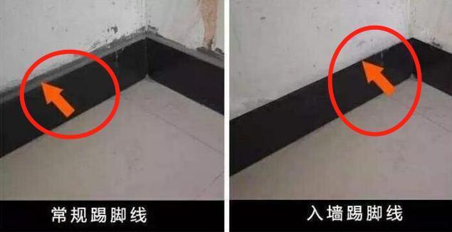 踢脚线一般铺设形式有常规的明贴踢脚线,还有就是这个入墙式的暗贴踢脚线,那在这过来人的经验告知大家,能装入墙式的就装入墙式的,因为明贴踢脚线容易落灰层,清洁增加负担,后期摆家具的时候,还不能直接贴墙上,会有很大的缝隙死角。非常的难看。